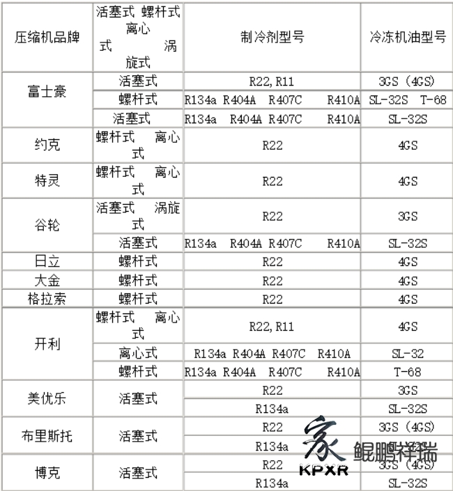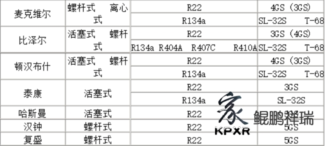 制冷劑與冷凍油對(duì)照表