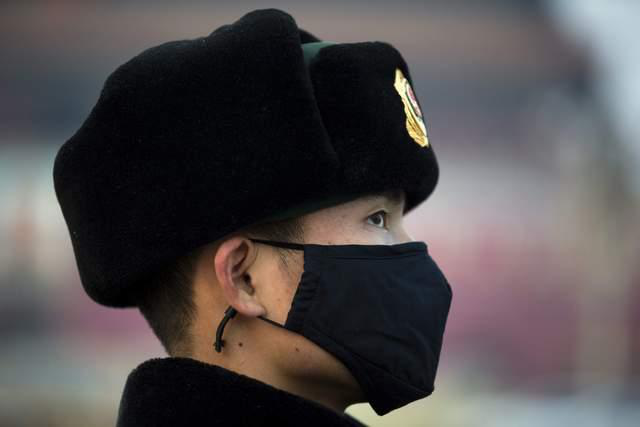 資料圖:霧霾天氣中,戴著口罩在天安門廣場執(zhí)勤的警員。