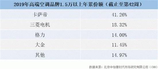 從高端份額來(lái)看,中怡康第42周監(jiān)測(cè)數(shù)據(jù)顯示,在1.5萬(wàn)+高端價(jià)位段中,卡薩帝、三菱電機(jī)和格力年累份額分別為41.26%、18.32%和14%。這三大品牌占據(jù)了7成以上份額,高端市場(chǎng)形成“三分天下”競(jìng)爭(zhēng)格局。