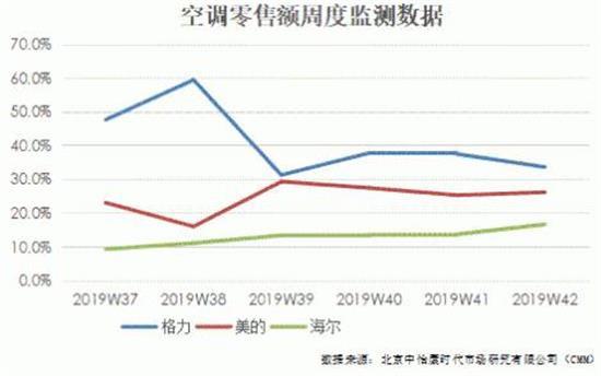 在市場(chǎng)趨勢(shì)階段性向好的同時(shí),國(guó)內(nèi)各主要空調(diào)品牌抓住增長(zhǎng)機(jī)遇,積極應(yīng)對(duì)。從中怡康發(fā)布的空調(diào)市場(chǎng)周度監(jiān)測(cè)數(shù)據(jù)來(lái)看,2019年第42周(10.14-10.20)格力、美的、海爾繼續(xù)穩(wěn)居空調(diào)市場(chǎng)TOP3,總體份額達(dá)到76.1%。其中,從37周到數(shù)據(jù)42周(見(jiàn)下表)來(lái)看,各品牌市場(chǎng)零售額占比中,三強(qiáng)格局穩(wěn)定,格力份額第一,地位仍然無(wú)人撼動(dòng),海爾份額穩(wěn)中有升。