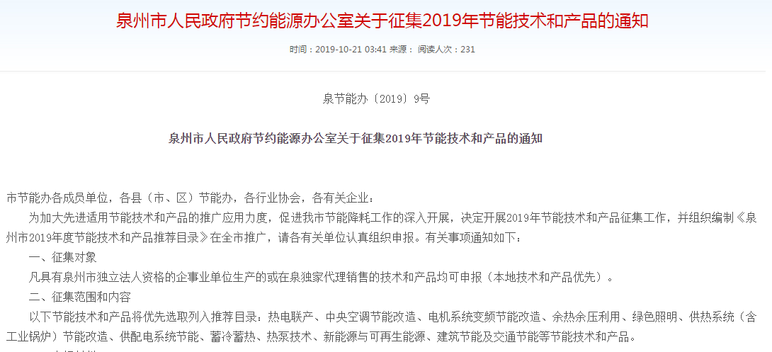 《泉州市人民政府節(jié)約能源辦公室關(guān)于征集2019年節(jié)能技術(shù)和產(chǎn)品的通知》中提到,以下節(jié)能技術(shù)和產(chǎn)品將優(yōu)先選取列入推薦目錄:熱電聯(lián)產(chǎn)、中央空調(diào)節(jié)能改造、電機(jī)系統(tǒng)變頻節(jié)能改造、余熱余壓利用、綠色照明、供熱系統(tǒng)(含工業(yè)鍋爐)節(jié)能改造、供配電系統(tǒng)節(jié)能、蓄冷蓄熱、熱泵技術(shù)、新能源與可再生能源、建筑節(jié)能及交通節(jié)能等節(jié)能技術(shù)和產(chǎn)品。