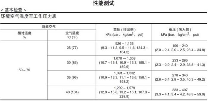 上是日產新奇駿維修手冊中給出的各狀態(tài)下空調系統(tǒng)壓力值。
