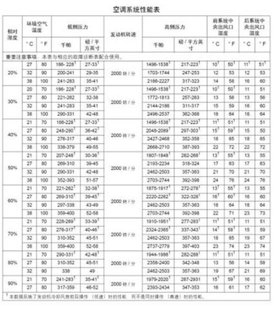 兩張表中都給出了各溫度和濕度下的空調系統(tǒng)工作壓力,但是GL8車型需要在發(fā)動機轉速2000r/min的狀態(tài)下測量,而奇駿只是怠速下測量,所以GL8的空調系統(tǒng)壓力值要比奇駿高很多。因此,對于您正在維修的車輛,幫主沒法給出標準答案,一切都在維修手冊中,這才是我們修車時的最高法典。
